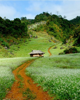 The little house in a white rapeseed flower field in Moc Chau
